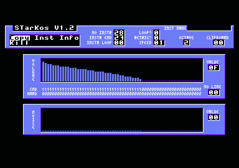 STarKos is a conventional soundchip tracker, in the sense that writing music is done the same way as existing trackers on CPC or Atari ST. The new features mainly comes from sound editing.